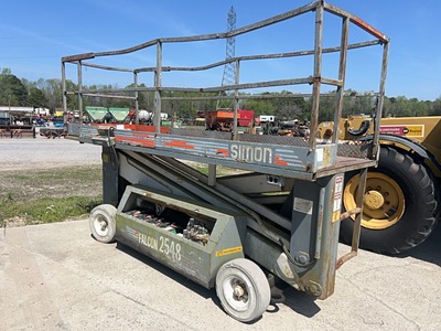 SIMON FALCON 2548 SCISSOR LIFT LOCATED AT SUFFOLK COTTON GIN, CALL 252.229.4331 serial number LGB00354, rated workload of 1000 pounds or 450 kg maximum occupants of three, maximum platform height is 25 foot, 24 V battery