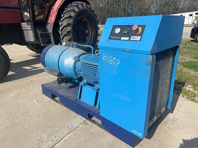 HYDRO VALVE AIR COMPRESSOR LOCATED AT SUFFOLK COTTON GIN, CALL 252.229.4331 Showing 24,787 hours, model number 818PSAS 08–2 336D205, serial number 818–001705–0608, 18 kW, nine max bar, 1750 RPM